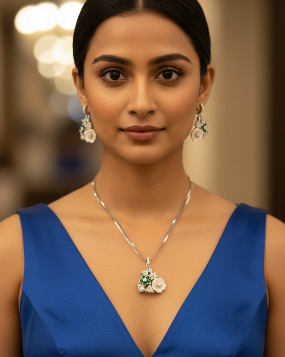 A stunning silver floral necklace paired with delicate emerald-accented earrings.