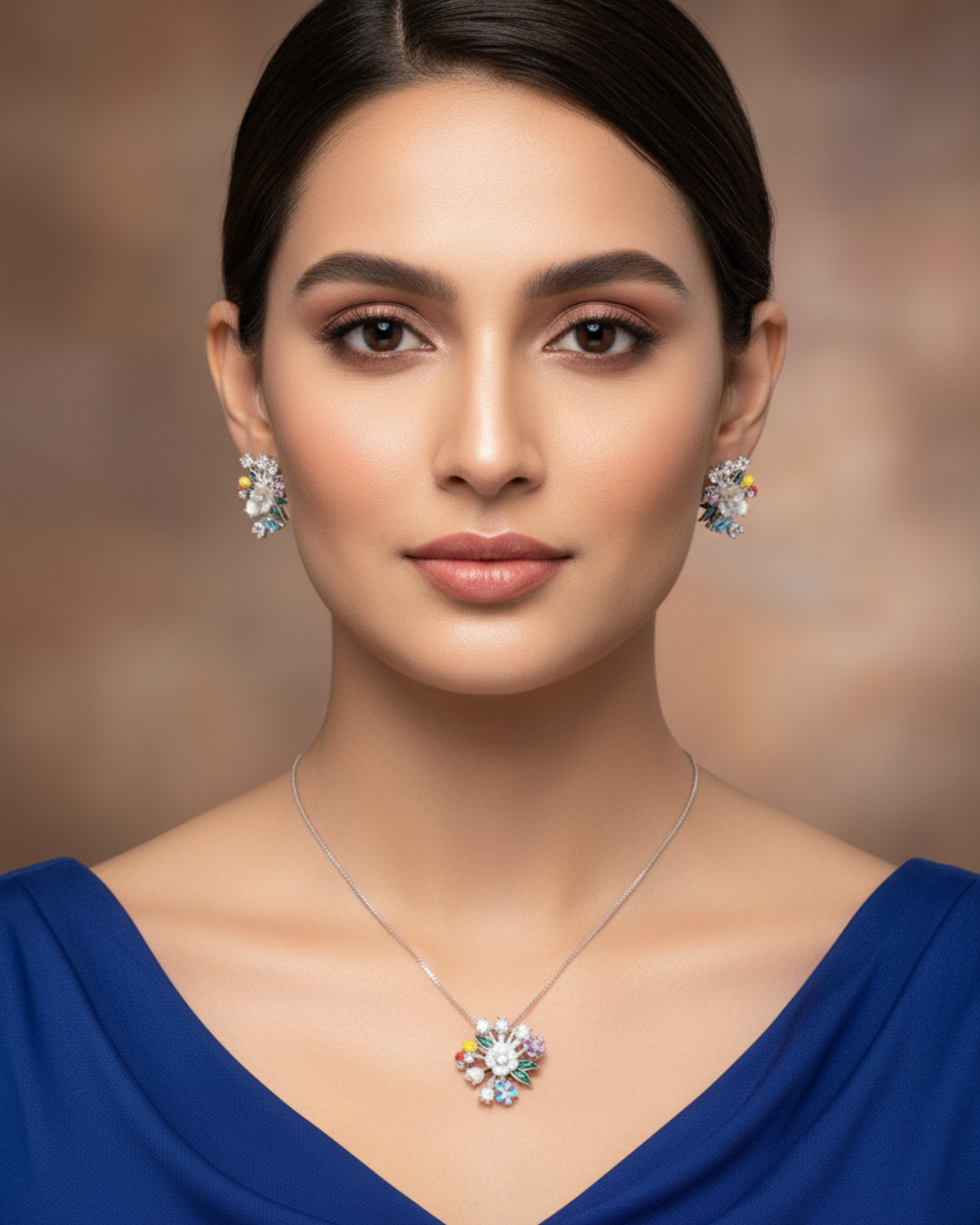 A vibrant multi-color floral necklace with premium crystal detailing.